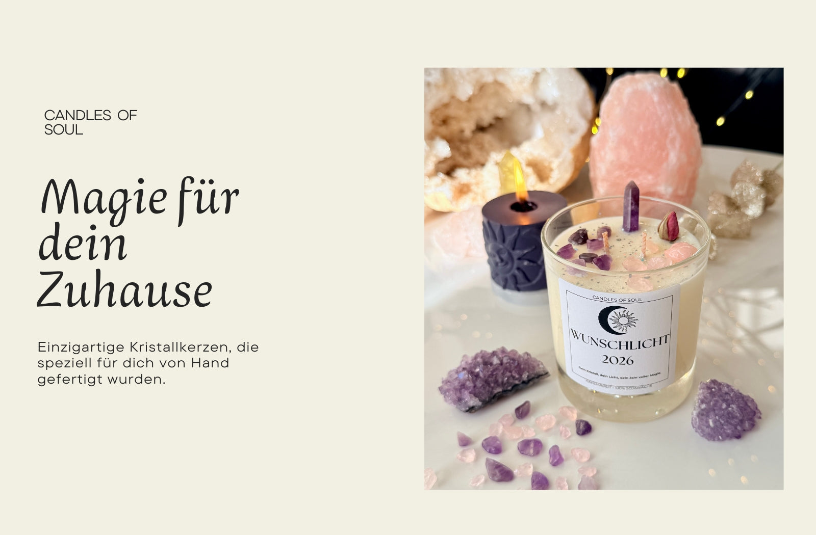 Jede Kerze bei Candle of Soul ist ein liebevoll handgemachtes Unikat – gegossen in kleiner Auflage, veredelt mit echten Kristallen und sorgfältig ausgesuchten Edelsteinen. Unsere besonderen Duftkerzen verbinden stilvolles Lichtambiente mit der magischen Kraft von Edelsteinen.