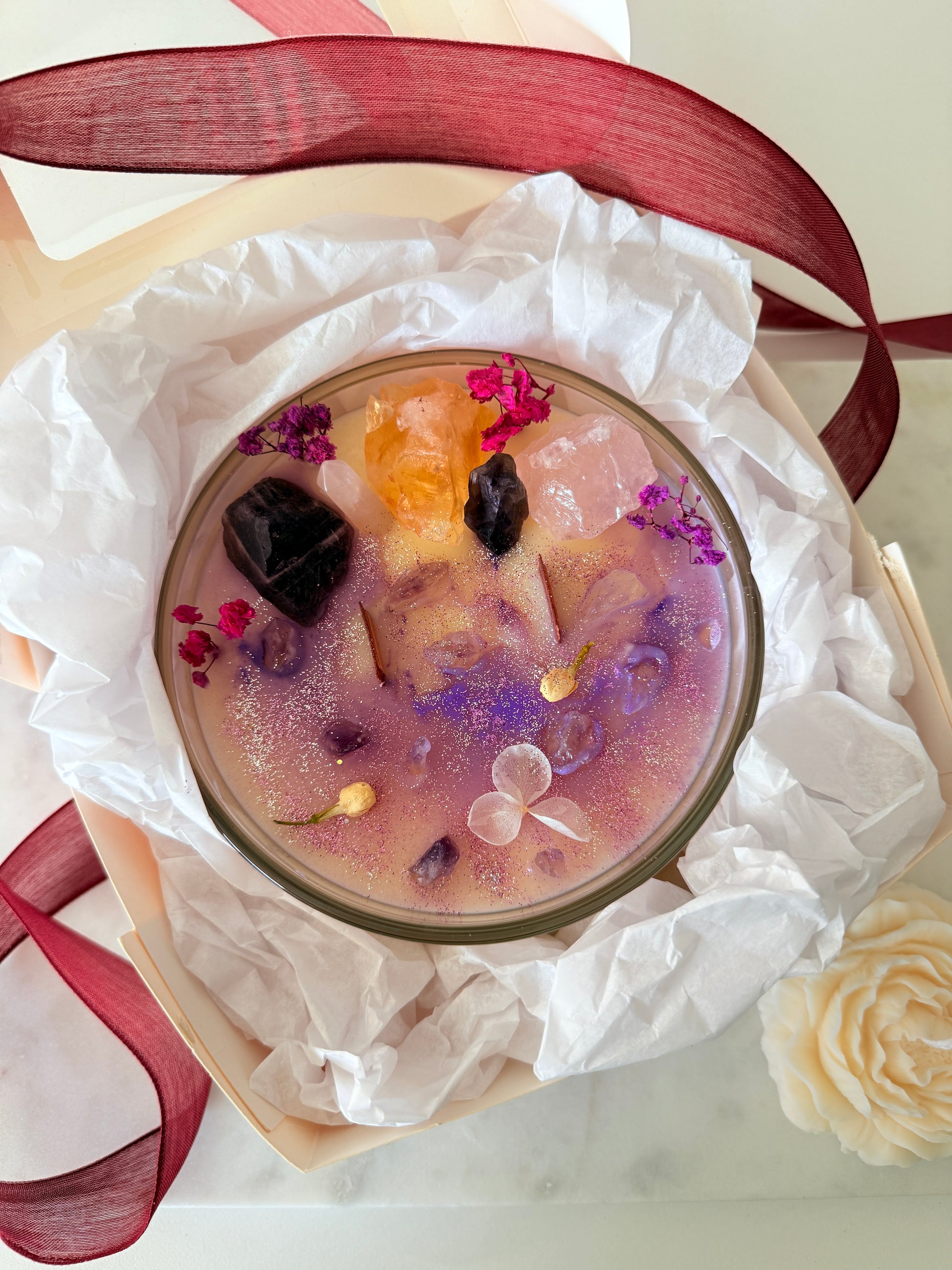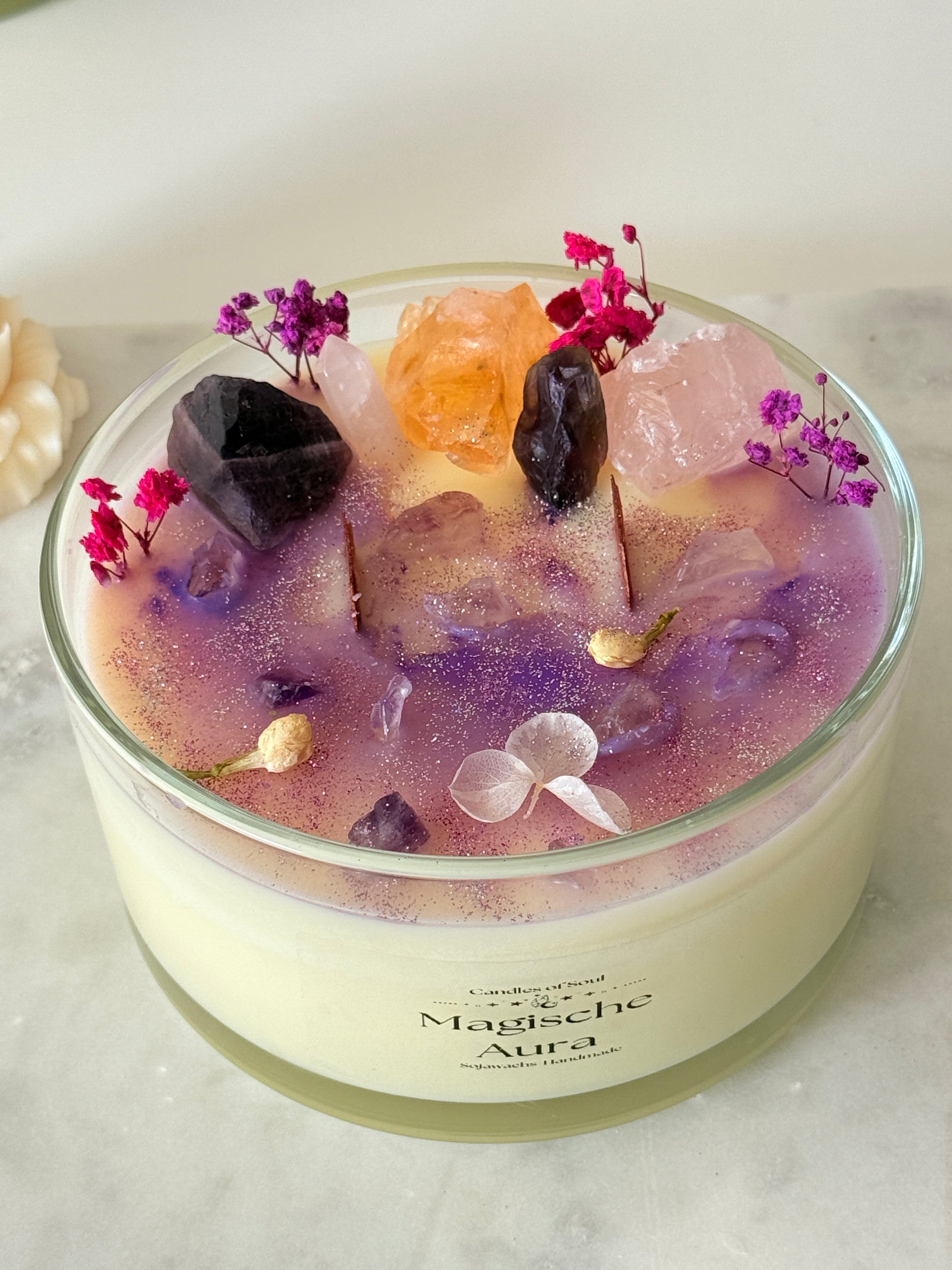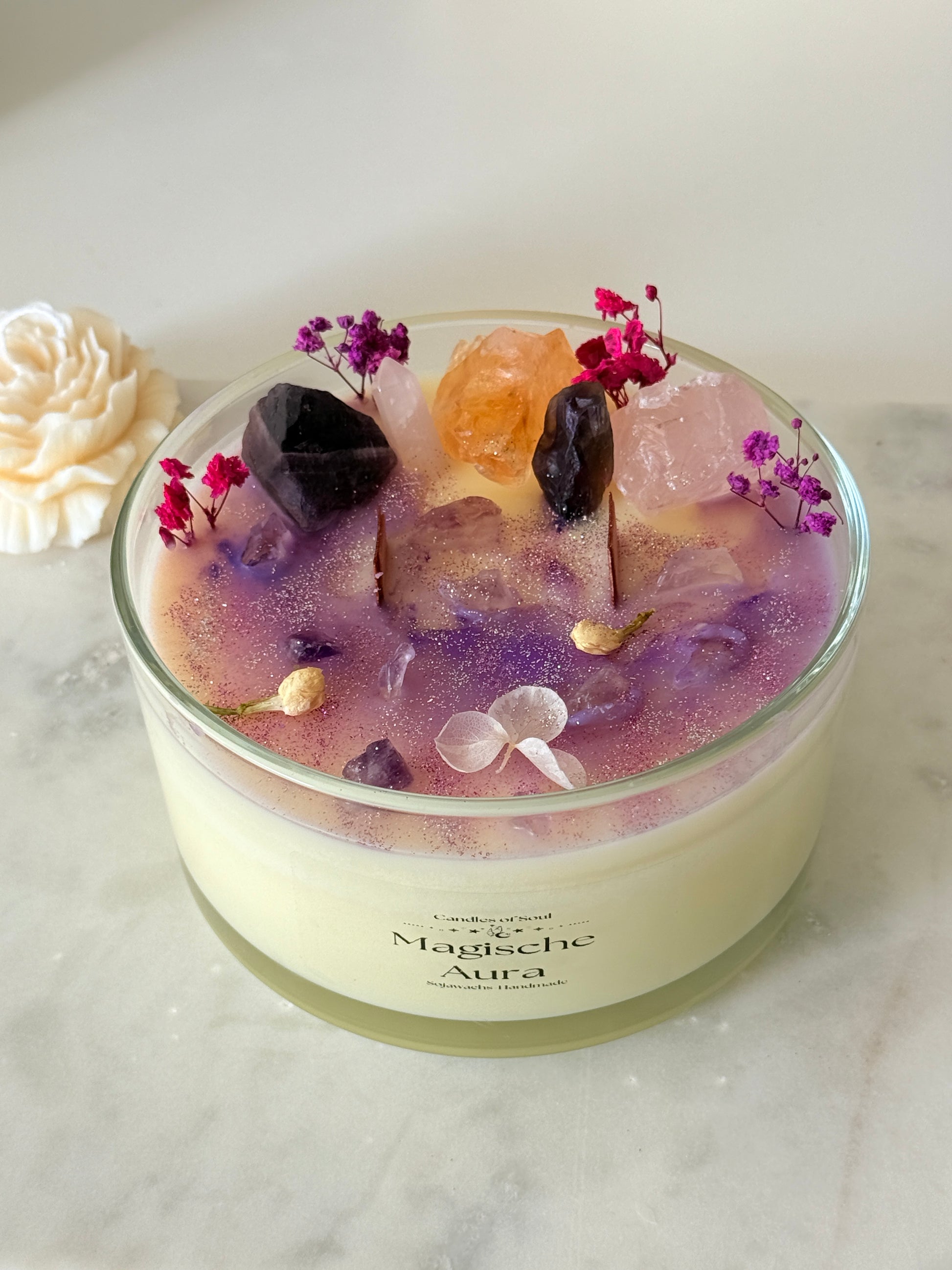 Die Kerze ist reich mit natürlichen Kristallen wie Amethyst, Rosenquarz und Ctrin dekoriert – perfekt für alle, die sich nach Harmonie und positiver Energie sehnen. Jeder Kristall wurde sorgfältig ausgewählt und ist dafür bekannt, Schutz, Liebe und spirituelle Klarheit zu fördern. Kleine, farbige Blüten verleihen der Kerze einen einzigartigen, zauberhaften Touch, der die Magische Aura in deinem Zuhause verstärkt.