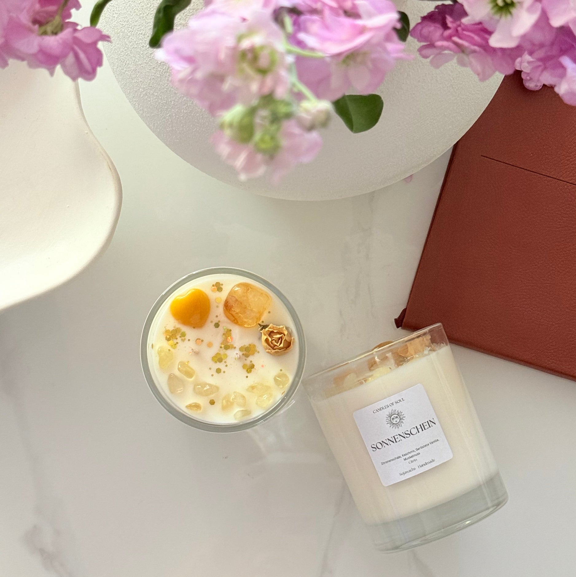 SONNENSCHEIN ist deine tägliche Portion Licht und Lebensfreude. Diese handgegossene Kristallkerze vereint die Kraft des Citrins mit einem sonnigen Duft aus Zitronenschale, Kaschmir, Vanille und Moschus – für ein warmes, belebendes Raumgefühl.